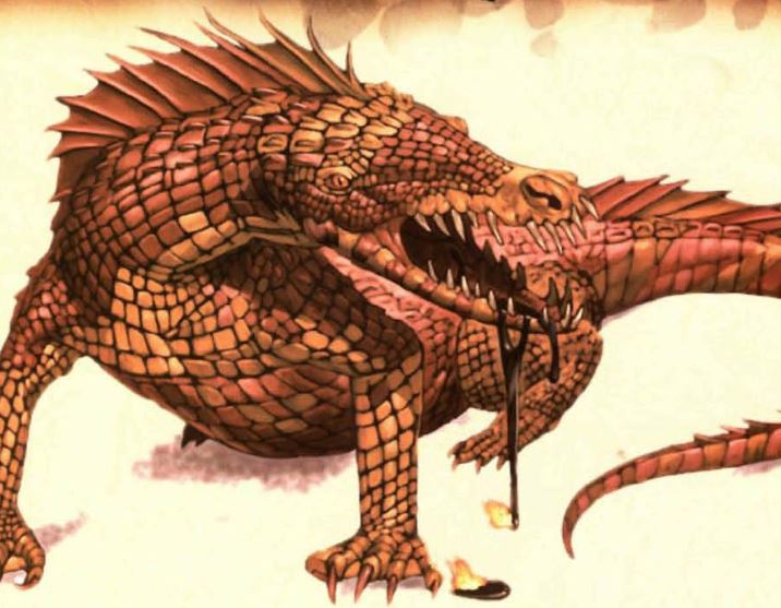 Orange dragons, sometimes called sodium dragons, are a crossbreed of red and yellow dragons. (Yellow dragons, you say? Keep reading.) Orange dragons first appeared in an issue of Dragon magazine in 1982. They live in tropical swamps and rainforests and walk low to the ground like an alligator. Their breath weapon is a sticky stream of saliva which then explodes like napalm or white phosphorous. They are Neutral Evil.